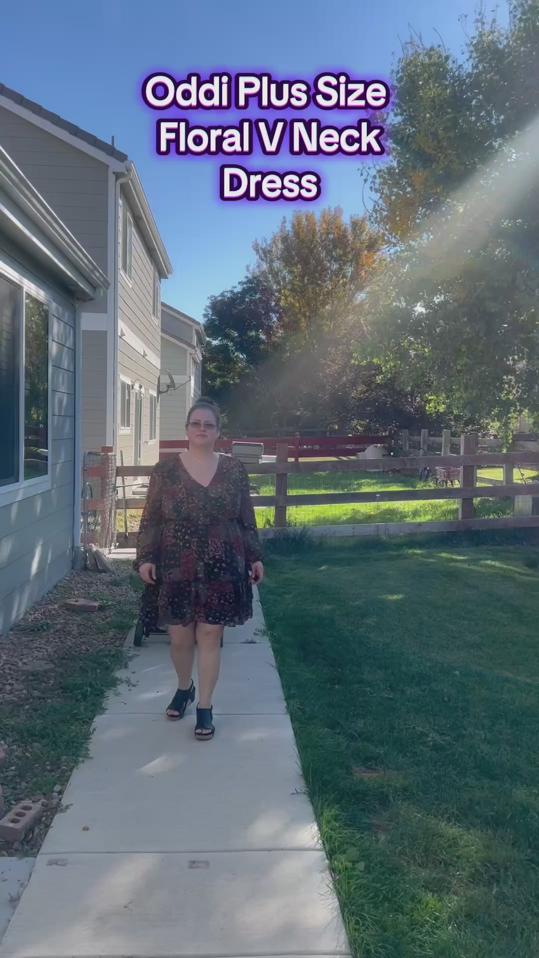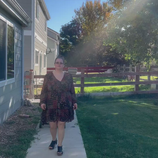 Floral V-neckline dress featuring front button closure, ruffle detail, self belt, long sleeve, and fully lined. Fits true to size.